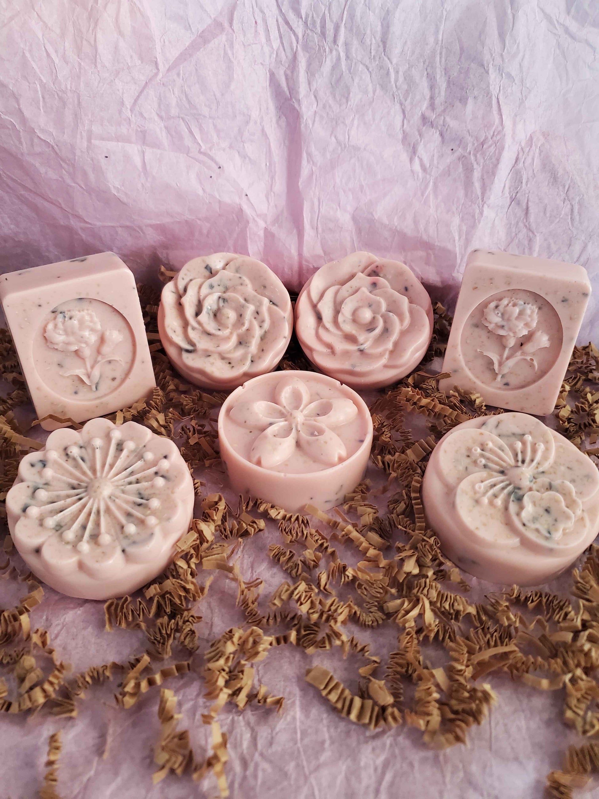 3.5oz Goat Milk soap base infused with Tallow, Sweet almond oil/jojoba oil/grapeseed oil.sunflower oil, powdered oats, turmeric, essential oils for a natural scent, mica powder for coloring and bentonite clay